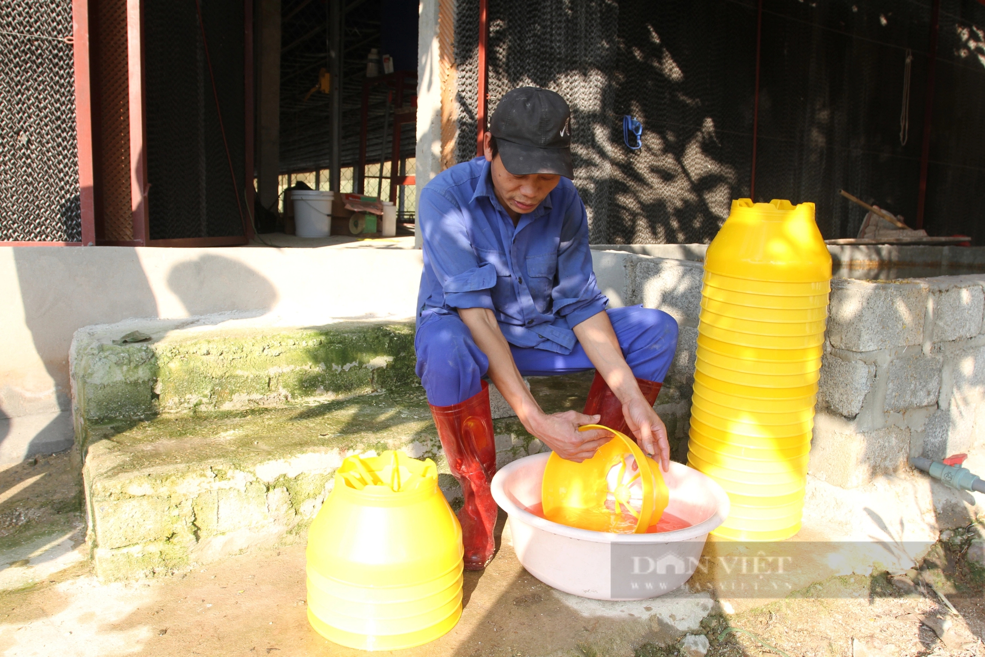 Trước khi cho gà ăn, hệ thống máng ăn được vệ sinh, khử trùng sạch sẽ để phòng ngừa dịch bệnh. Ảnh: Hà Thanh